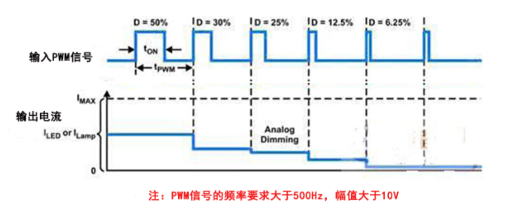數(shù)字調(diào)光又稱PWM調(diào)光,通過(guò)PWM波開(kāi)啟和關(guān)閉LED來(lái)改變正向電流的